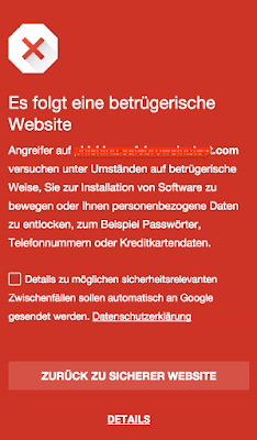 Wenn ihr Android nutzt, dann habt ihr ihn wahrscheinlich schon! Der neue Safe Browsing-Client unter Android ist Teil unserer Google Play-Dienste und ab Version 8.1 verfügbar. Chrome ist die erste App, die ihn nutzt (ab Version 46), d. h., alle Chrome-Nutzer unter Android werden jetzt standardmäßig von uns geschützt. In Chrome könnt ihr unter "Einstellungen" > "Datenschutz" überprüfen, ob Safe Browsing aktiviert ist und ihr geschützt seid. Chrome warnt euch vor gefährlichen Websites (siehe Abbildung unten). Und genauso wie auch auf Desktopgeräten